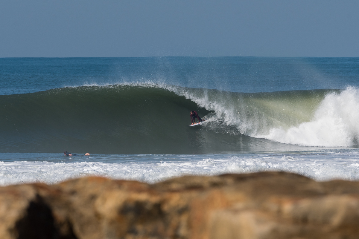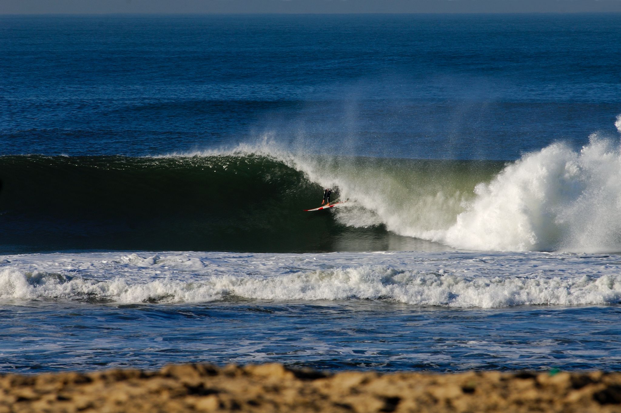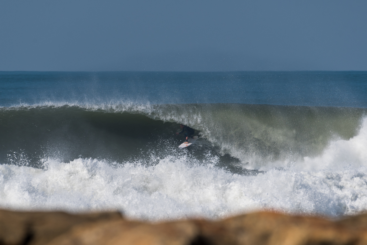 A direita da Praia dos Pescadores, vulgo "Cagas", quebra perfeita por vezes com cerca de 500 metros de comprimento - aqui Fredy prepara-se para entubar - Click por Pablo Martinez