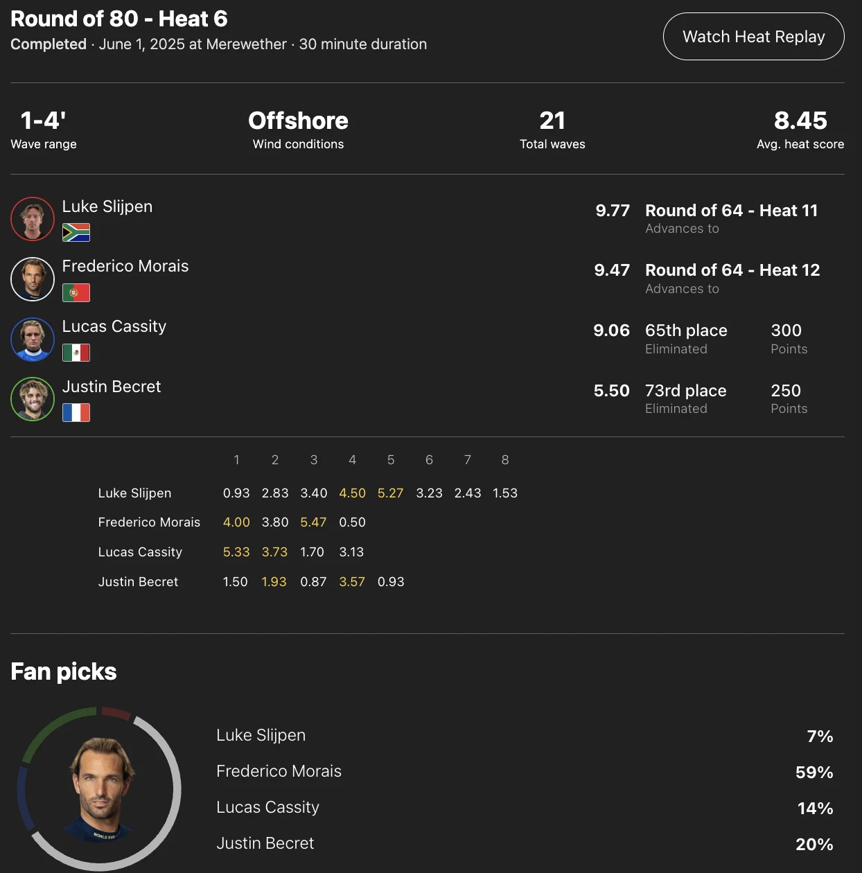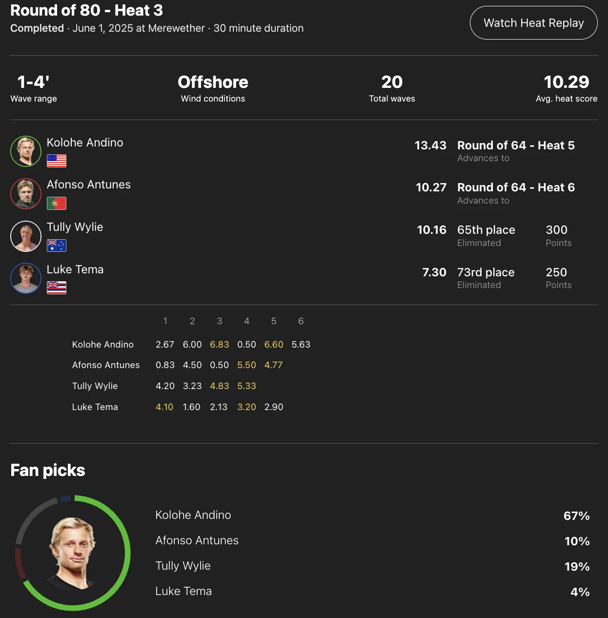 Antunes que surfou com Kolohe Andino somou um total de 10.27 pontos no seu heat, passando em segundo para a próxima fase. Um excelente indicador que Afonso está em boa forma. Também Morais avançou para a ronda 2 com um total de 9.47 pontos, mostrando consistência e foco logo na estreia desta etapa. Ambos os surfistas portugueses asseguraram assim a continuidade na competição e o objetivo de garantir um lugar entre os melhores para o Championship Tour 2026.