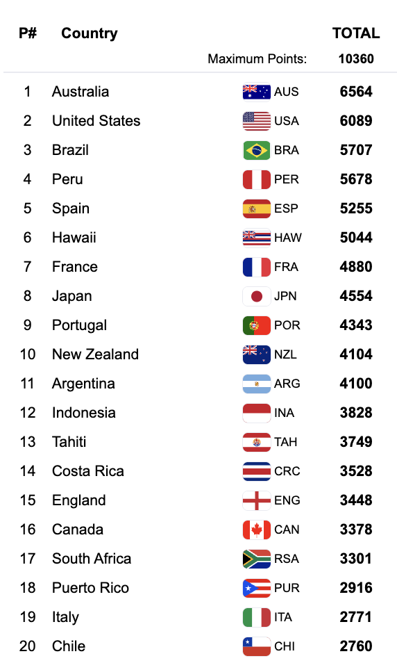 Os Estados Unidos terminaram na segunda posição coletiva, impulsionados pela vitória de Bailey Turner em Sub-16 femininos, enquanto o Brasil fechou o pódio por equipas, mantendo-se entre as potências do surf jovem mundial.