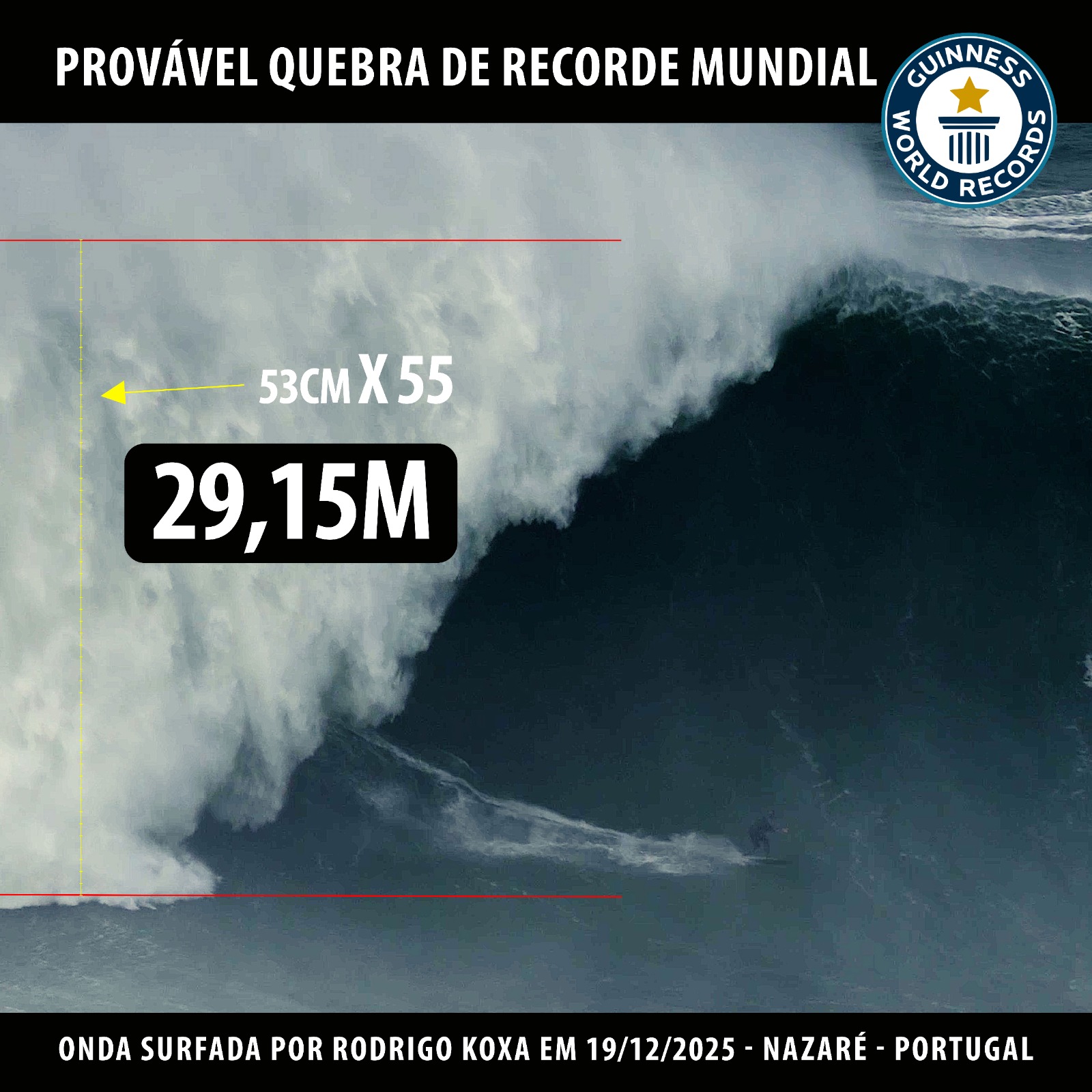 Uma nova medição técnica e científica realizada nos últimos dias aponta para que a onda surfada por Rodrigo Koxa, no passado dia 19 de dezembro de 2025, na Praia do Norte, Nazaré, possa ter atingido 29,15 metros de altura, valor que, a confirmar-se oficialmente, ultrapassaria o atual recorde mundial da maior onda alguma vez surfada.