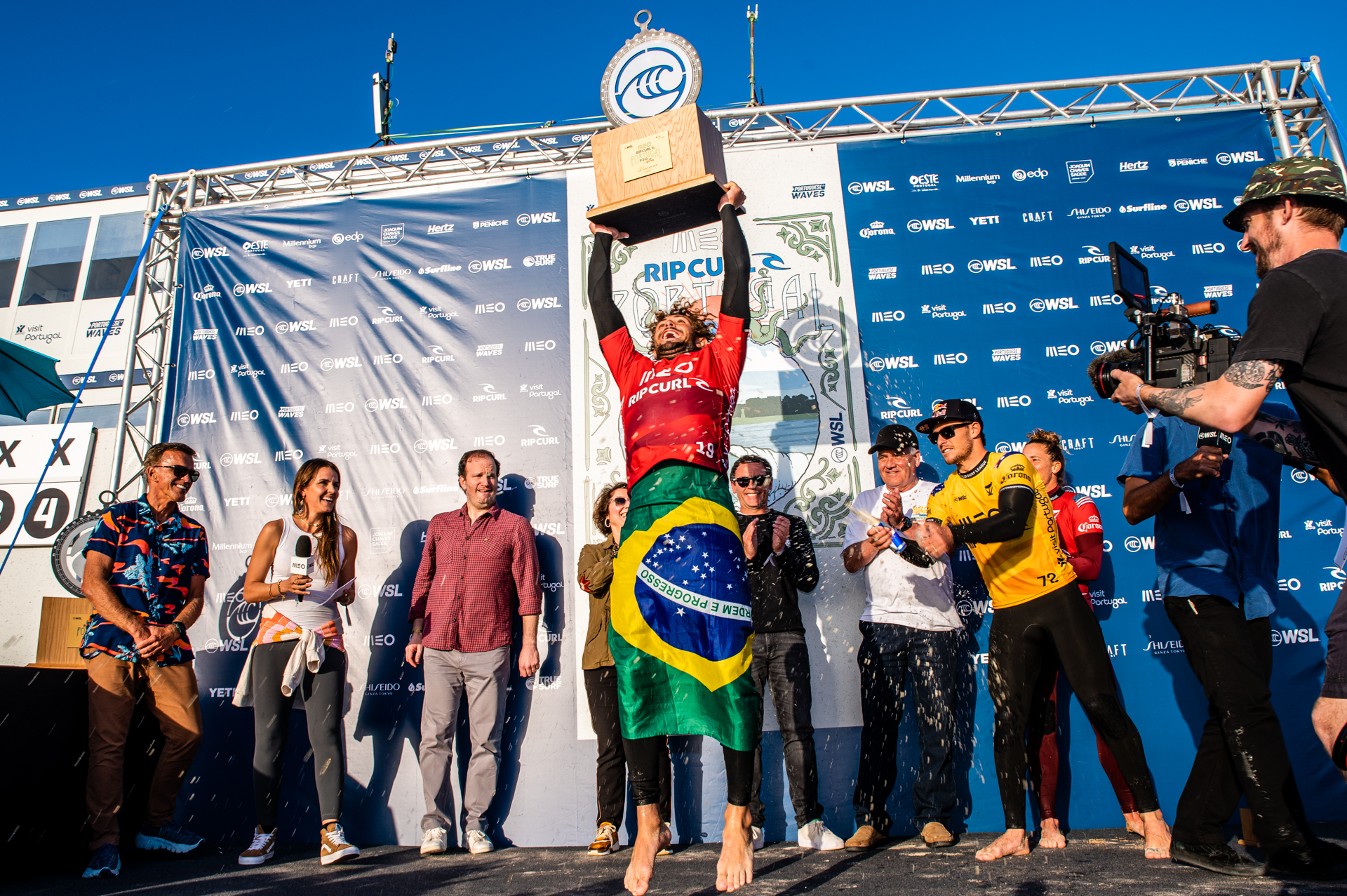 Fast-forward para 2023. O MEO Rip Curl Pro Portugal é mais um êxito retumbante. Segundo estimativas fornecidas pela Altice — a proprietária da marca MEO depois da compra da PT — 150 mil pessoas terão passado pela praia de Supertubos entre 8 e 14 de março, e o público online terá gerado 5,3 tb de tráfego. Um assombro! Mesmo levando em conta a febre inflacionária de audiências que afeta a WSL desde os seus primeiros tempos, uma observação a olho nu nos Super permitia concluir que um eventual exagero nos números não o terá sido em demasia. Portugal, a par do Brasil — coincidentemente, ou não, duas etapas que apresentam operadores de telecomunicações como naming sponsors — permanece como uma das poucas operações rentáveis do circuito e modelo a implementar em toda a Liga.