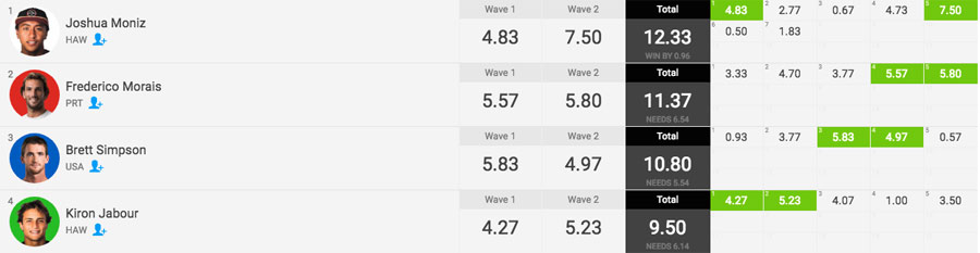 A vitória no heat, essa, ficou com Joshua Moniz que a determinada altura registou uma nota de 7.50 pontos e a partir desse momento passou a gerir melhor o desenrolar da bateria. Já Morais, depois de uma troca acesa de ondas com Brett Simpson, um dos favoritos locais, que fez o português passar - por momentos - de segundo para terceiro lugar, e vice-versa, assegurou o 2.º lugar na bateria na sua última onda - 5.80 pontos.
