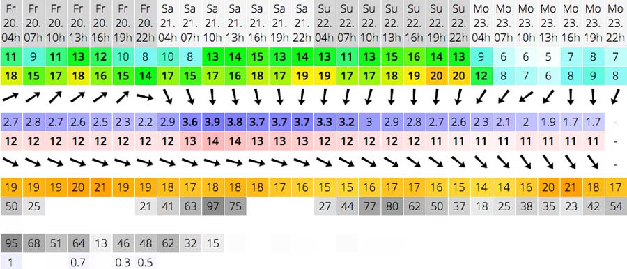 Lentamente, ao longo de sexta-feira, a ondulação, orientada quase de oeste, subirá até 2.7m com 12 segundos de período. O vento (de sudoeste), porém, não é o melhor e o mais provável é que o primeiro dia do período de espera seja de “lay day”.