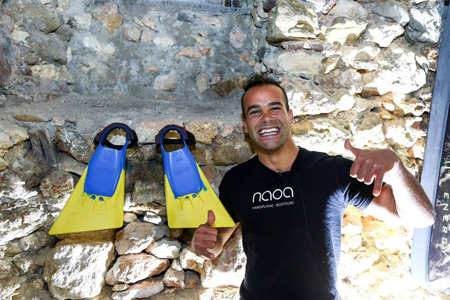 Ao contrário dos seus pares, não foi a prancha de Kalani que passou a ser exposta no referido espaço museológico, mas antes os pés de pato que o próprio usou nas primeiras sessões pelo Canhão.