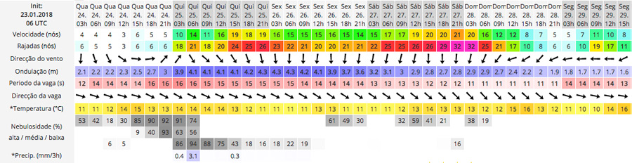 O vento norte volta a ganhar alguma força, atingindo rajadas de 29 nós ao final da tarde, e a tendência de queda da ondulação, agora ainda mais de norte, mantém-se - 3,0m até 2,7m com 12 segundos de período. Matosinhos, com 0,5m, Costa Nova, com 1,5m, Cabedelo da Figueira, com 1,0m, Praia do Norte, com sets até 3,5m, Supertubos, com 1,5m, Carcavelos, com 1,0m, Arrifana, com 1,0m, Beliche, com 0,5m, são algumas das opções.
