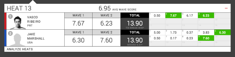 Vasco Ribeiro defrontou o americano Jake Marshall, e começou ‘a sério’ na sua segunda onda, com uma série de manobras poderosas de frontside, sempre na zona certa da onda, que os juízes premiaram com 7.67 pontos. De seguida o surfista da Poça repetiu a receita para uma onda avaliada em 6.17 e mantinha-se na dianteira do heat frente ao americano Jake Marshall, e com prioridade a seis minutos do fim. Nos instantes finais do heat Jake e Vasco arrancaram - cada um para a sua onda - e o público ficou em suspenso. Jake 'sacou' um aéreo e parecia prestes a passar para a frente de Vasquinho, que todavia ainda conseguiu melhorar a sua onda de backup. Os dois surfistas esperavam impacientes pelas notas que pareciam demorar uma eternidade a sair, e no final... um empate! Vasco acabou por seguir em frente no 'tie break' por ter feito a nota mais alta do heat, o 7.67!