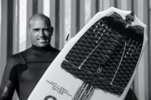 Kelly Slater examina ao pormenor o traction pad feito de algas