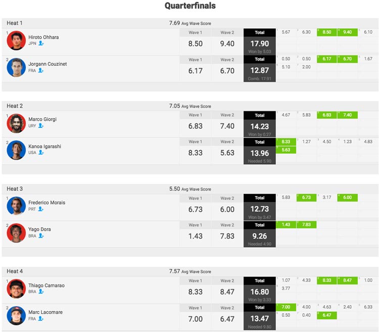 Chamada de atenção também para os desempenhos do japonês Hiroto Ohhara, que afastou o francês Jorgann Couzinet no primeiro heat dos quartos de final (com 8.50 + 9.40 = 17.90), e para o uruguaio Marco Giorgi que passou por um dos grandes favoritos, o norte-americano Kanoa Igarashi, no Heat 2, por 14.23 a 13.96 pontos.