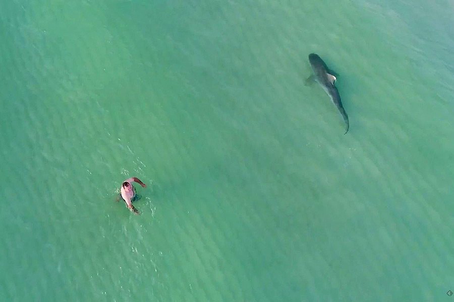 Estranhamente, devido à calma apresentada nas imagens de vídeo, os banhistas ao banho também parecem não ter dado pela presença do animal. Eventualmente, quem sabe, devido ao ruído produzido pelo drone a voar sobre as suas cabeças.