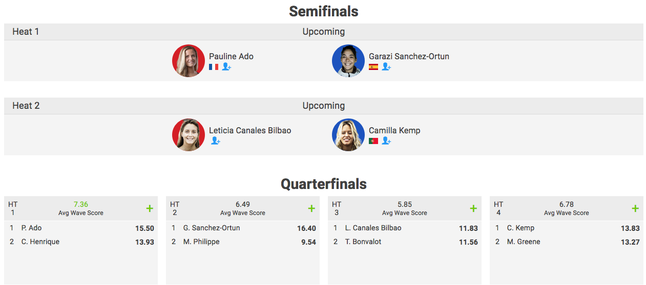 Já no evento feminino com a presença de ainda três atletas lusas em prova, foi a Cascalense Camilla Kemp que se deu melhor e conseguiu uma preciosa vaga nas meias finais. Camilla que entrou no ultimo heat dos 1/4 de final, derrotou a Australiana Mikaela Greene, conquistando assim uma vaga nas meias finais.