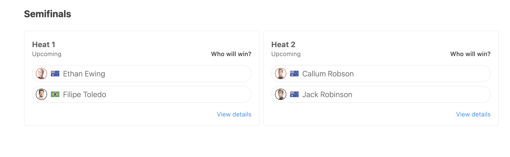 Jack Robinson entrou no heat que fechou o dia de prova contra Italo Ferreira com a última tendência: uma prancha menor e um volume maior numa onda que se apresenta com pressão e tamanho. Atacou as junções determinado e começou por arrancar um 7 pontos. A resposta de Italo Ferreira, que em ondas anteriores cometeu alguns erros, veio na mesma moeda e alcançou um 7.10 pontos subindo para primeiro. A escassos minutos do final, Robinson precisava de 6.51 pontos para avançar mas Italo não tinha uma grande distância de segurança do australiano pelo que a onda final foi decisiva, quer para Jack subir para primeiro quer para Ferreira assegurar a liderança. A última de Italo ainda entrou para o somatório, um 6.70 pontos que totalizou num score final de 13.80 pontos e, já na areia, o australiano ficou a saber que na sua última onda, apanhada a segundos antes do soar da buzina, tinha sido avaliada em 7 pontos, o que o conduziu às semi-finais e eliminou Italo Ferreira com um total de 14 pontos.