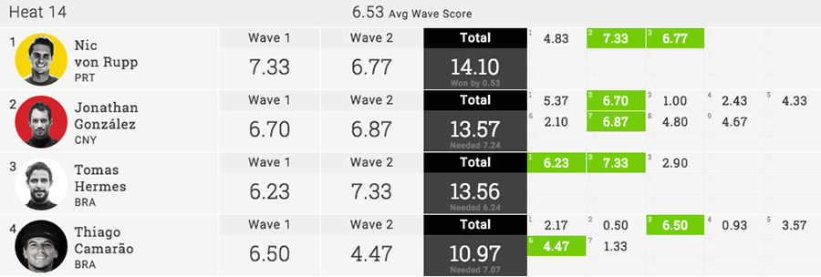 O mar não troixe o reconhecido poder de Saquarema, pelo que a escolha de ondas se revelou um fator chave ao longo do dia em que se realizaram 16 heats. Destaque para Marlon Lipke que fez uma das melhores ondas do dia (8.40 pontos) e para a tremenda eficácia de Nic von Rupp que precisou de apenas três ondas para vencer um dos heats mais equilibrados do dia. Nic esteve na liderança do heat até aos cinco minutos finais, altura em que caiu para terceiro, mas na primeira oportunidade que teve, conseguiu encaixar três boas manobras de backside e recuperou a liderança mesmo a tempo de garantir a qualificação para a ronda 2. "Apostei nas direitas, tal como fiz o ano passado. Espero conseguir melhorar esse resultado", disse Nic, no final do heat. Recordamos que na prova de Saquarema da época passada Nic terminou no 9º lugar.