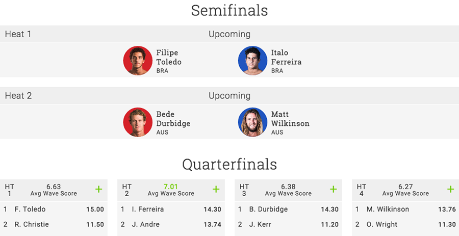 Owen Wright e Matt Wilkinson discutiram a última vaga nas meias finais, e a vitória foi para Wilko, que teve uma entrada fortíssima, a atacar ‘bottom to top’ uma direita de backside, e a disparar na liderança com 7.83 pontos. Owen não conseguiu mais do que pontuações medianas e acabou por ficar para trás irremediavelmente.