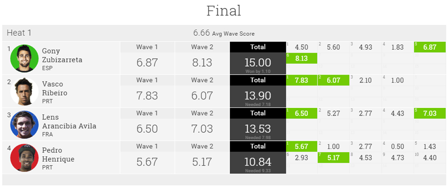 Já a final começou um pouco morna, com os atletas a apostarem numa estratégia de paciência em busca das melhores ondas que chegassem à costa. Pedro Henrique ainda liderou as operações nos instantes iniciais, mas cedo Vasco Ribeiro, com uma escolha de ondas irrepreensível, passou para a dianteiro da bateria. E quando tudo parecia alinhado para que o Campeão Mundial Júnior, Campeão Europeu Júnior e Tricampeão Nacional de Surf vencesse a etapa na Costa da Caparica, eis que os espanhol Gony Zubizarreta 'inventa' 8.13 pontos numa das últimas ondas da prova e confirma a reviravolta no resultado. Vasco Ribeiro fixou-se assim no 2º lugar da bateria, ainda assim à frente do francês Arinciba Avila e de Pedro Henrique.