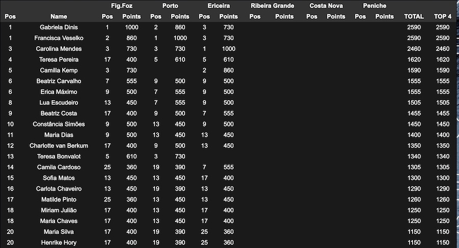 Ranking Feminino Liga Meo Surf 2023 após Ribeira(Top 20):