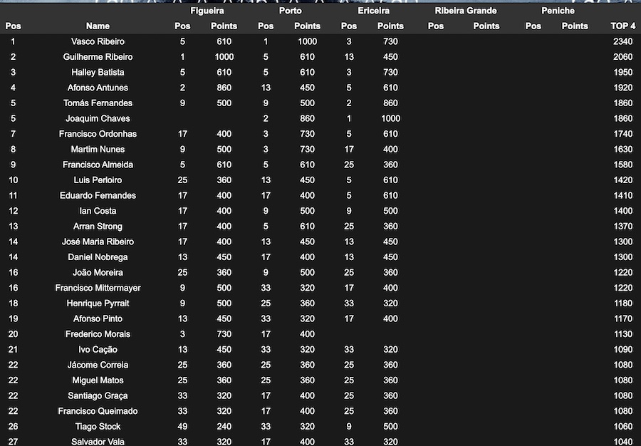 Ranking masculino Liga Meo Surf 2023 após Ribeira(Top 27):