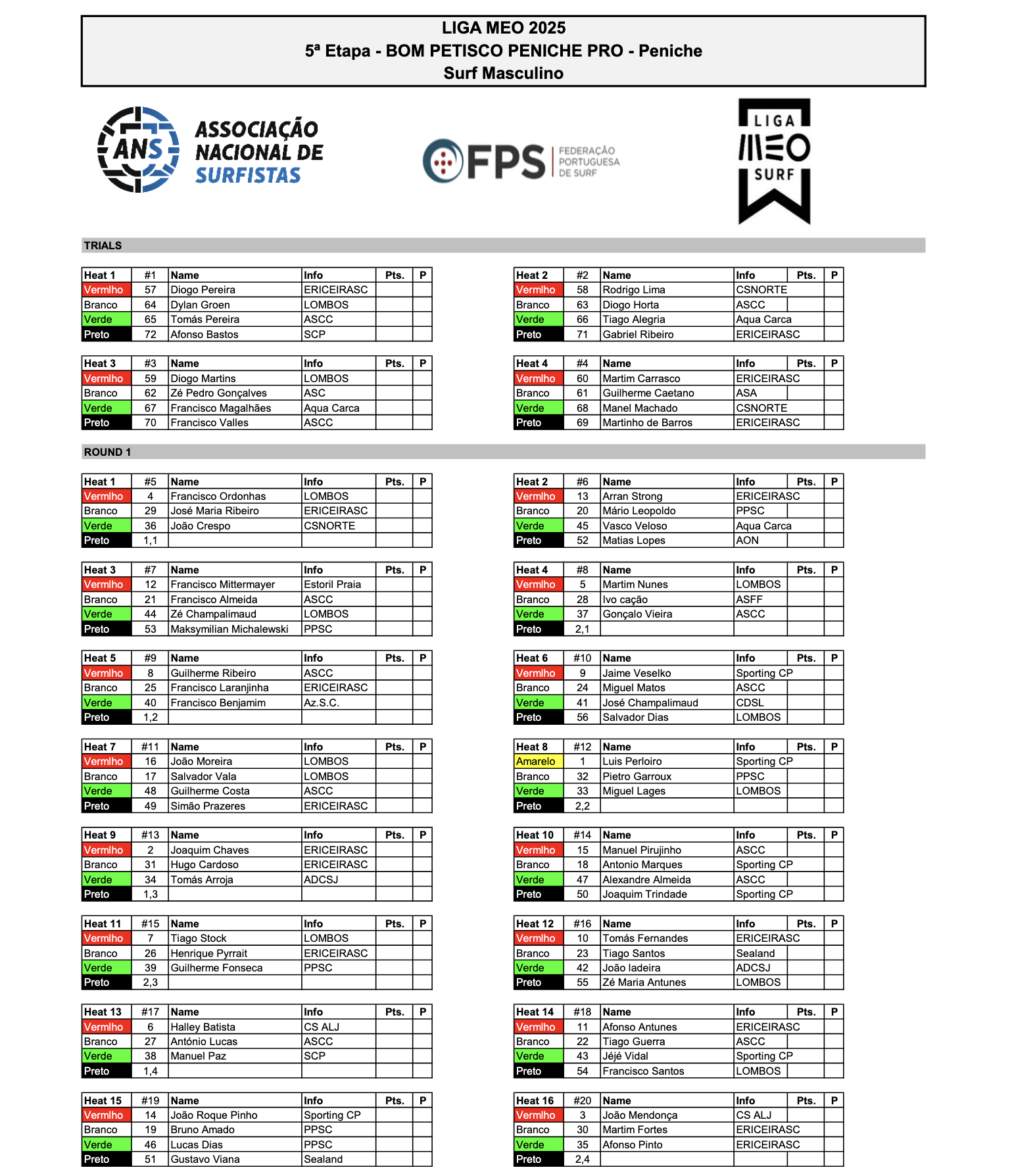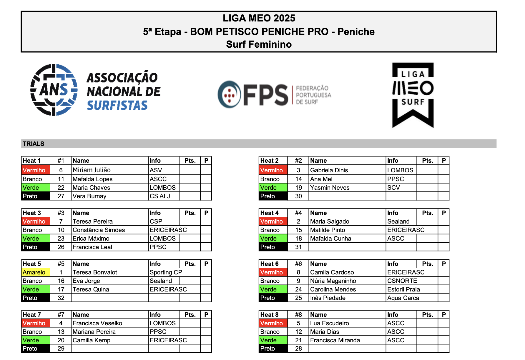 A Liga MEO Surf 2025 aproxima-se do desfecho e já é conhecido o quadro de heats do Bom Petisco Peniche Pro, a última etapa do circuito nacional de surf, que vai decorrer entre 24 e 26 de outubro, na Praia do Lagido, em Peniche.