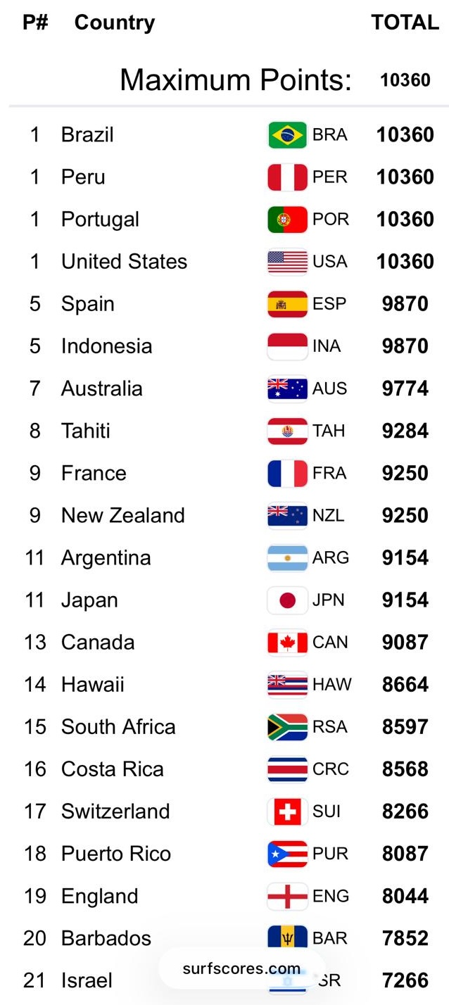 Num ranking de máxima pontuação possível (10 360 pontos), Portugal encontra-se empatado com Brasil, Peru e Estados Unidos no topo da tabela, demonstrando consistência coletiva.