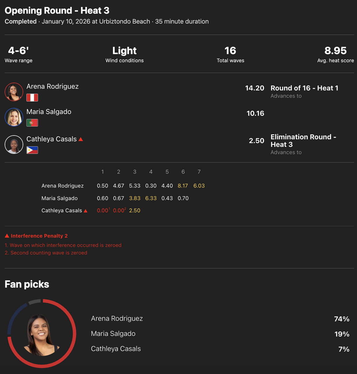 Apesar de não ter conseguido a vitória no heat, Maria Salgado apresentou uma prestação consistente e segura, terminando na segunda posição com um score total de 10,16 pontos, apenas superada por Arena Rodriguez, que assinou a melhor performance do dia no quadro feminino, com 14,20 pontos e a primeira nota excelente do evento.