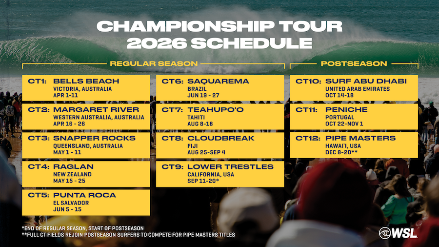 A temporada de 2026 arranca em Bells Beach, na Austrália, e termina no Banzai Pipeline, no Havai, com o Pipe Masters a decidir os títulos mundiais. As classificações finais serão apuradas com base nos nove melhores resultados em 12 eventos.