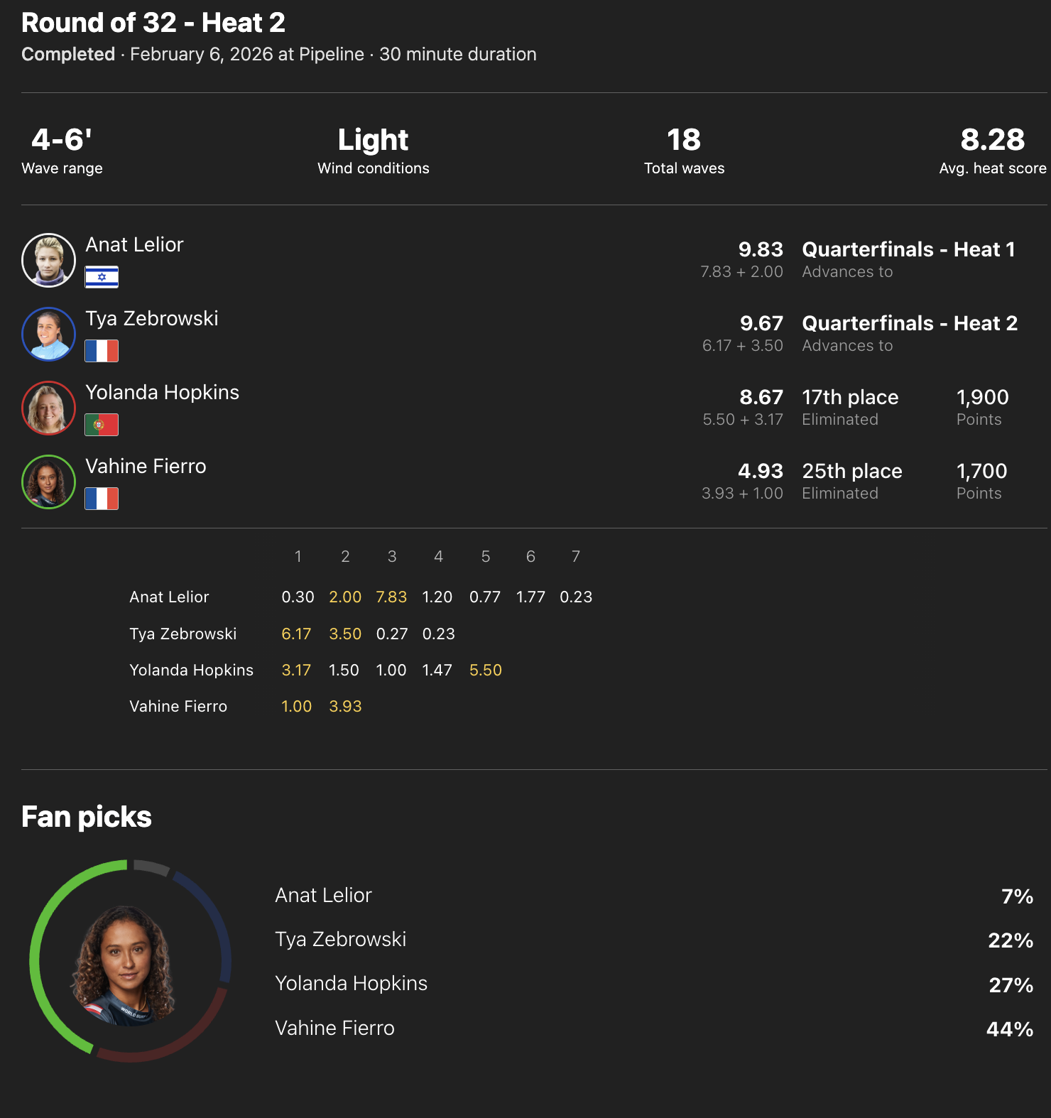 Trata-se de um heat de elevado nível, com destaque para a jovem canadiana Erin Brooks, uma das surfistas mais consistentes em ondas de consequência, e para a japonesa Anon Matsuoka, conhecida pela sua eficácia em tubos.
