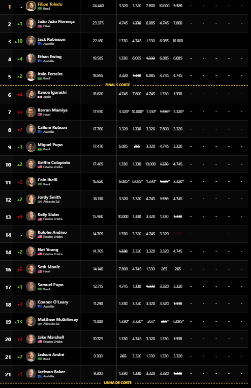 Eis os atletas que prosseguem no Tour e têm em vista agora qualificarem-se para a finalíssima, a WSL Finals, onde só os cinco primeiros lugares no ranking competem pelo título mundial: